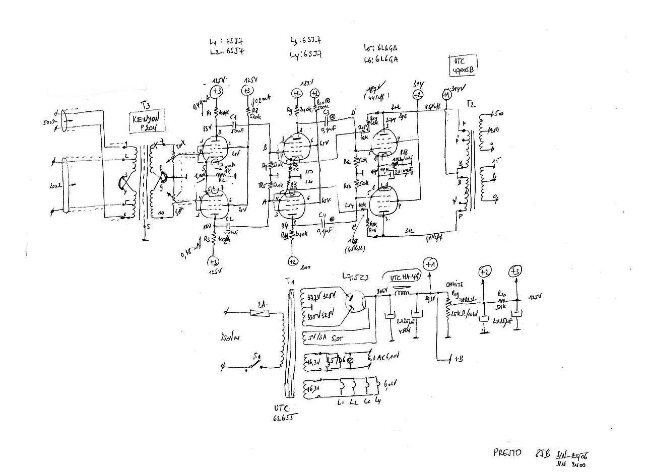 Ik heb eerst getracht het schema op te nemen. Dit is een langdurig proces. Eerst teken je de bedrading onderaan het chassis na, en van daaruit, met behulp van de aansluitgegevens van de buizen, kom je tot een min of meer deftig schema. Probleem is ook dat er vaak geen aansluitgegevens te vinden zijn van de gebruikte transformatoren.